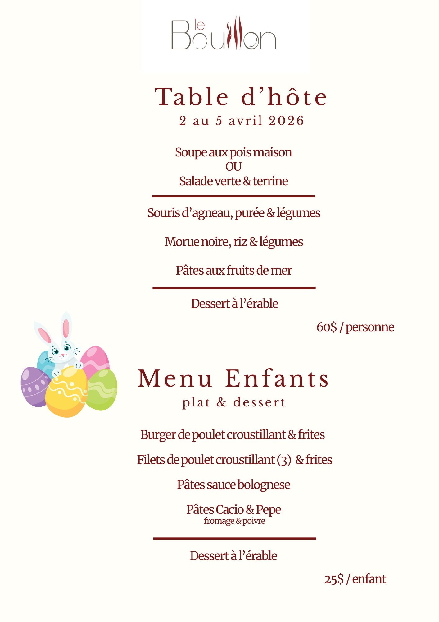 HORAIRE PÂQUES du 2 au 5 avril 2026 Souper dès 17h – sur réservation Menu spécial – table d’hôte seulement